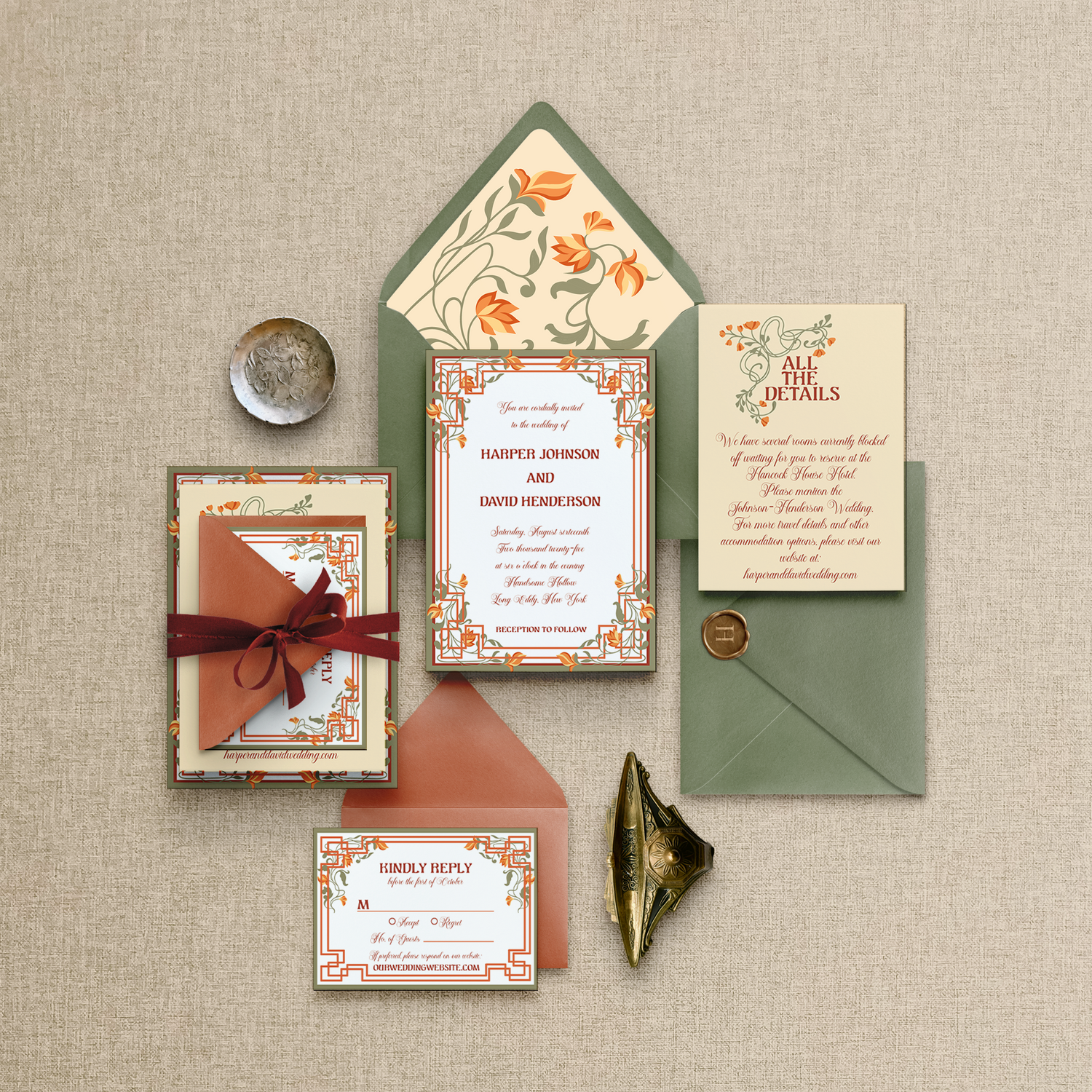The Heart Nouveau suite captures the elegance of turn-of-the-century artistry with its curved motifs, botanical flourishes, and warm, romantic palette. Perfect for couples drawn to vintage beauty and timeless design, this collection transforms your wedding stationery into works of art. From invitations to RSVP cards, menus, details, and more, each piece blooms with intricate patterns and heartfelt charm — a modern love story written in classic style.