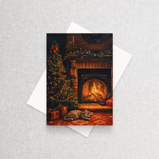 Cozy Cat by the Fire | Custom Christmas Card Set of 12
