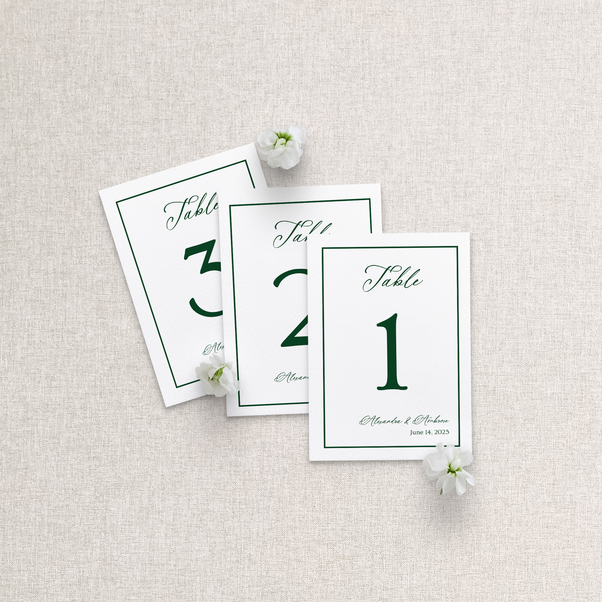 Our table numbers are crafted from 120 lb superfine eggshell textured paper, offering a luxuriously tactile finish. For an even more substantial feel, double-thick cardstock is available as a premium upgrade.