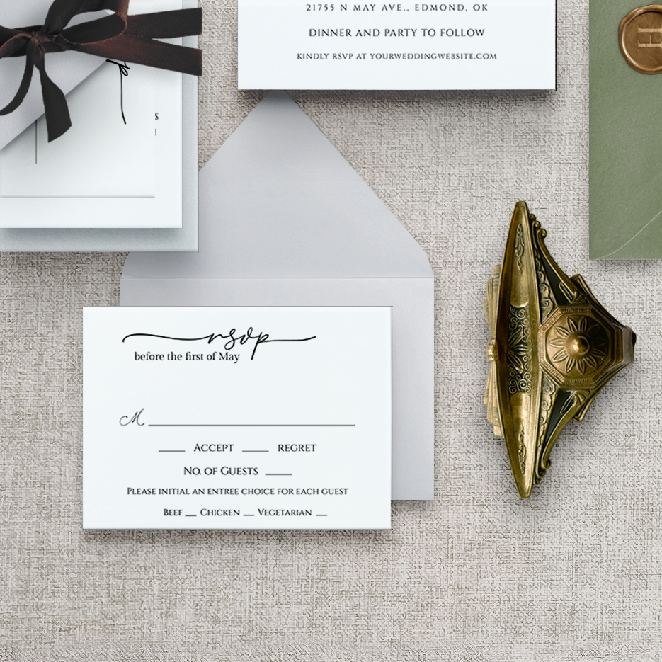 Our invitation suites are crafted from 120 lb superfine eggshell textured paper, offering a luxuriously tactile finish. For an even more substantial feel, double-thick cardstock is available as a premium upgrade.